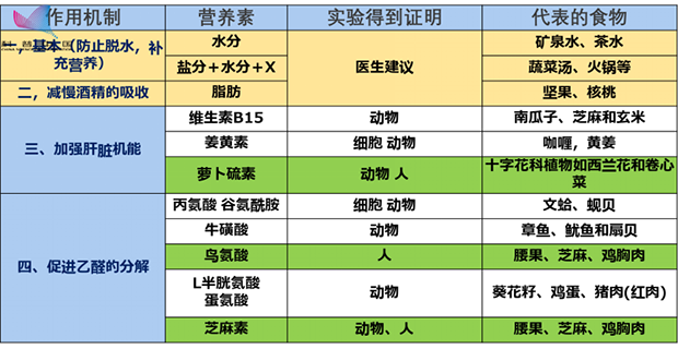除了芝麻,花生,小麥,大麥也含有芝麻素。腰果、芝麻、雞胸肉中富含的鳥氨酸的解酒作用。在臨床試驗(yàn)中已得到證實(shí),鳥氨酸可以增強(qiáng)氨的代謝,防止由于酒精代謝過程中由于氨蓄積引起的疲勞感,通過調(diào)節(jié)尿素代謝,增加氨的排泄,以達(dá)到解酒的目的??ㄗ?、和豬肉中富含的L-半胱氨酸和蛋氨酸通過和乙醛結(jié)合,將其轉(zhuǎn)化成無毒的物質(zhì),幫助消除由喝酒引起的血液中的乙醛。