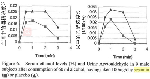 對9名男性患者飲酒后的調(diào)查,芝麻素服用組( )和普通未服用組( )相比,由于酒精代謝快,血液中的乙醇濃度和尿中的乙醛濃度較低,因此引起的醉酒癥狀也較輕。(圖片來源:參考文獻(xiàn)6)