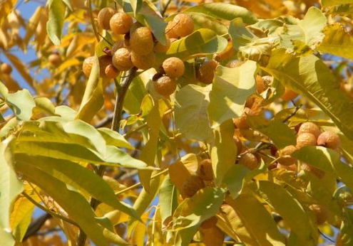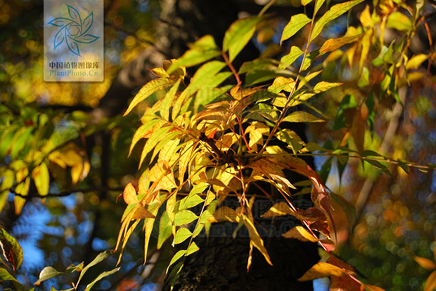 無患子(Sapindus mukorossi Gaertn.):黃色葉樹種。別名:木患子、油患子、苦患樹、鬼見愁等。落葉喬木,單回羽狀復葉,小葉對生;花序頂生,核果球形,成熟時為橙黃色,后變黑褐色。喜光耐寒,對二氧化硫抗性較強,常作為工業(yè)城市生態(tài)綠化的首選樹種。