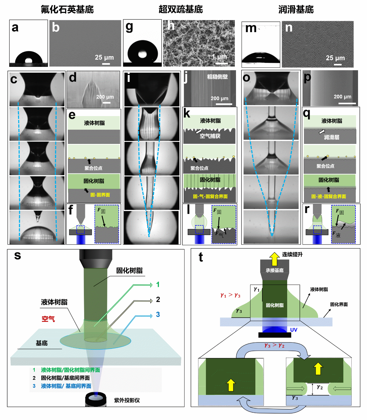 利用單個(gè)墨滴就能精確打印出你想要的東西,聽(tīng)上去是不是很神奇。那么這一過(guò)程是如何實(shí)現(xiàn)的呢?研究人員發(fā)現(xiàn),實(shí)現(xiàn)單墨滴3D打印的關(guān)鍵是三相接觸線的可控回縮,這主要涉及3D打印體系中三個(gè)界面間粘附力值的相對(duì)大?。杭匆后w樹(shù)脂與固化界面的粘附、固體樹(shù)脂與固化界面的粘附及液體樹(shù)脂與固體樹(shù)脂之間的粘附。為研究具有不同界面性質(zhì)的基底對(duì)單墨滴打印過(guò)程的影響,研究人員選擇了三種不同結(jié)構(gòu)的低粘附基底:光滑的氟化石英基底、具有微納復(fù)合結(jié)構(gòu)的超雙疏基底及潤(rùn)滑基底來(lái)進(jìn)行研究。