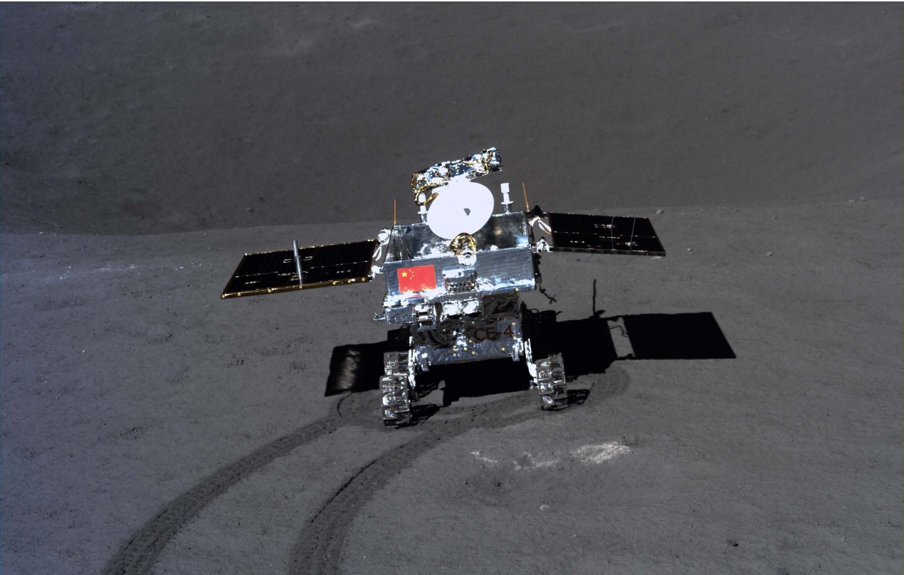 圖2. 玉兔二號倩影和月表上的車轍(圖片來源:中國國家航天局)