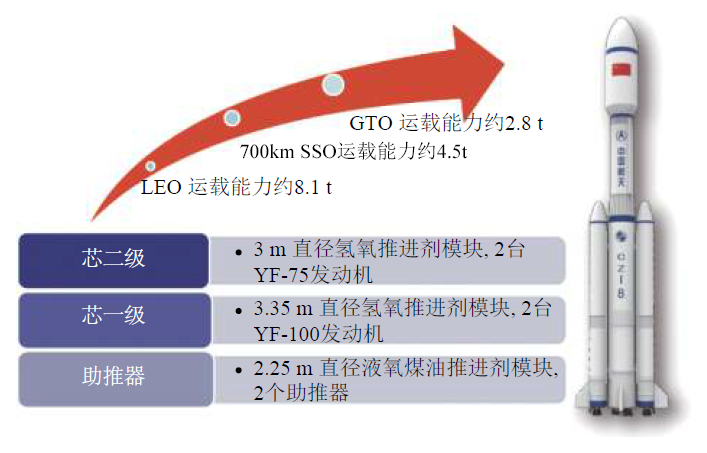 3.35米直徑配兩臺120噸級液氧煤油發(fā)動機YF-100的芯一級、2.25米直徑配一臺YF-100的助推器、3米直徑配兩臺8噸級液氫液氧發(fā)動機YF-75的二級、4.2米直徑的整流罩……很顯然,這就是把“長征七號”運載火箭的二級換成一個“長征三號甲”的氫氧三級,再去掉兩個助推器所形成的產(chǎn)物。