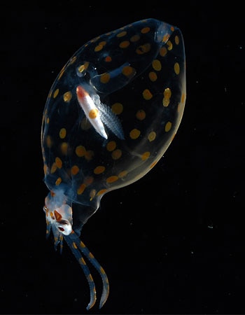 帆烏賊科,可見身上的發(fā)光器(紅色點(diǎn)狀物)。圖片來源:Nature Picture Library