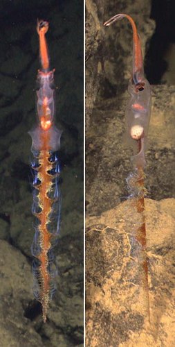 這些水域的頭足動(dòng)物差異十分巨大。從只有幾克重的火烏賊到重達(dá)500公斤的巨型大王酸漿魷,從凝膠狀漂浮的單盤蛸到肌肉強(qiáng)健,動(dòng)作敏捷的黵烏賊,從巨大眼睛的帆烏賊到眼睛退化的須蛸類,深海的頭足動(dòng)物顯示了毫不遜色于深海魚的多樣性。