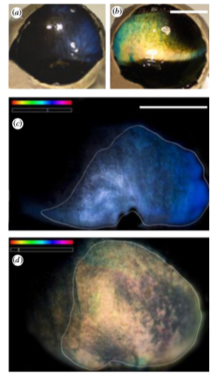 研究人員指出馴鹿眼睛的顏色由位于視網(wǎng)膜后的一種叫照膜的反射層調(diào)控,位于照膜的膠原纖維的疏密程度可以改變反射光的強度和波長。