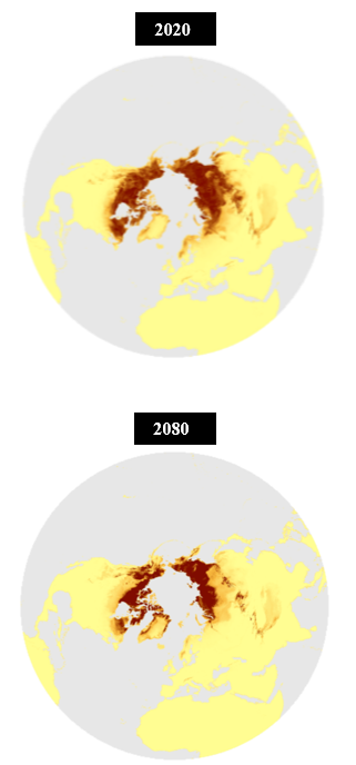 深色代表的適宜馴鹿生存的區(qū)域面積將急劇萎縮(圖片來源:參考文獻10)