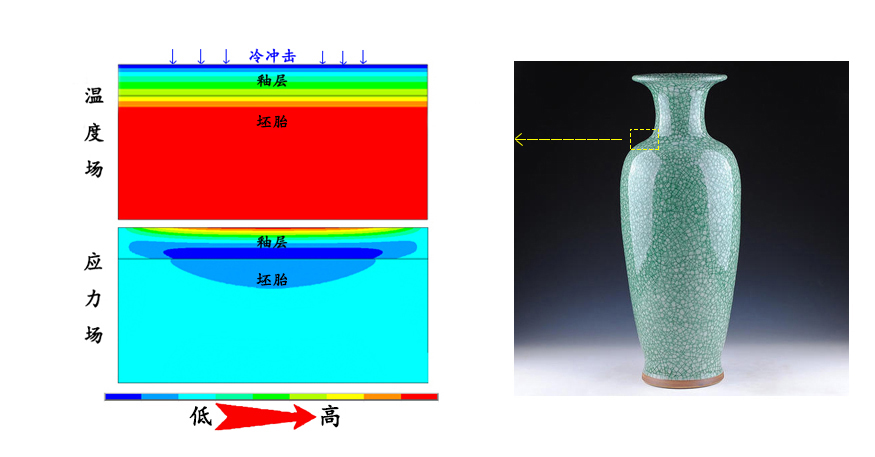 圖5 陶瓷表面受冷時(shí)應(yīng)力場(chǎng)和溫度場(chǎng)的有限元模擬(圖片來源:作者提供)