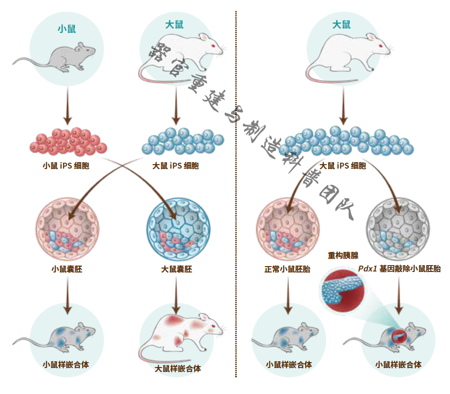 僅利用小鼠的胚胎干細(xì)胞就可以實(shí)現(xiàn)小鼠的胚胎嵌合,如果有了多個(gè)不同物種的干細(xì)胞之后就更為有趣了。2010年,日本科學(xué)家利用小鼠、大鼠兩種嚙齒類動(dòng)物的干細(xì)胞開展異種嵌合實(shí)驗(yàn),他將大鼠的iPS細(xì)胞注入到一種Pdx1基因敲除的小鼠的囊胚中(該基因敲除后,小鼠會(huì)因胰腺缺陷死亡),成功地在小鼠體內(nèi)獲得了來源于大鼠的胰腺器官,這是首次在異種動(dòng)物體內(nèi)獲得完整的功能器官[2]。
