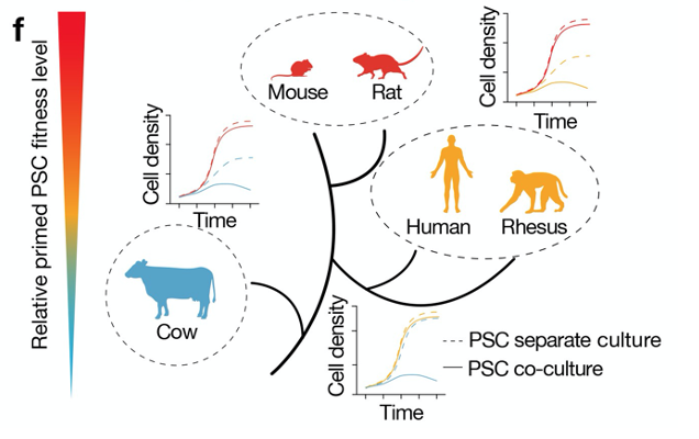 但大小鼠(嚙齒類)、人猴(靈長類)和牛的始發(fā)態(tài)干細(xì)胞之間相對(duì)競爭力狀態(tài)是不同的,在共培養(yǎng)體系中,這種競爭力狀態(tài)的不同會(huì)導(dǎo)致細(xì)胞競爭的發(fā)生,競爭力強(qiáng)的會(huì)誘導(dǎo)競爭力弱的凋亡,研究人員認(rèn)為這種競爭力狀態(tài)似乎跟物種間進(jìn)化距離密切相關(guān)。