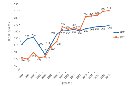1990~2017 年中國城鄉(xiāng)居民心血管病死亡率變化