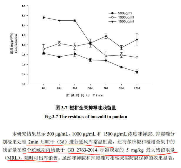 而最大濃度 1500 g/ml 濃度處理的椪柑,在整個儲存期,果肉中最高的殘留量也只有0.23微克/克,正常吃的風(fēng)險也幾乎可以忽略。