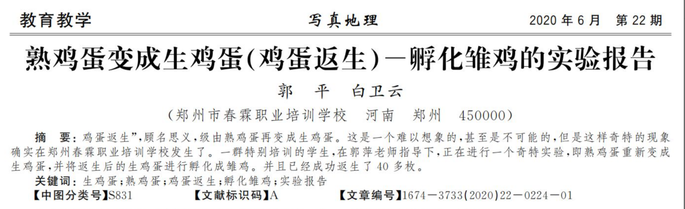 昨天有一個(gè)大新聞,《寫(xiě)真地理》這本雜志上發(fā)了一篇論文,有人通過(guò)超心理意識(shí)能量方法把熟雞蛋變生雞蛋,還孵出來(lái)了……