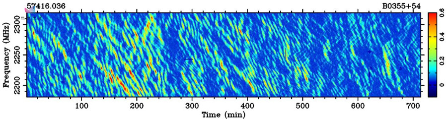 圖7 佳木斯66米射電望遠鏡觀測到的脈沖星B0355+54星際閃爍現(xiàn)象(P.F.Wang et al. 2018)。顏色表示脈沖星輻射的亮度,橫軸是時間,縱軸是電磁波頻率。