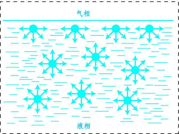 每個(gè)表面活性劑分子都有這種傾向,必然造成許多表面活性劑分子分布在表面上,導(dǎo)致水溶液的表面張力發(fā)生明顯下降。