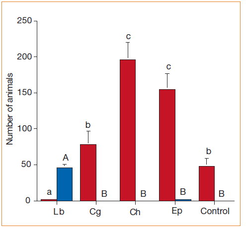 在飼養(yǎng)彈尾蟲的土壤中加入不同真菌后,彈尾蟲的存活情況:紅色部分表示彈尾蟲,藍(lán)色部分表示雙色蠟?zāi)?/p>