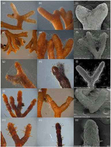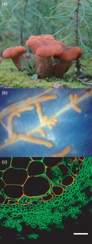 雙色蠟?zāi)⑴c北美喬松的菌根系統(tǒng):雙色蠟?zāi)⒌木z侵入根皮層中,布局在細(xì)胞間隙內(nèi)(圖c)染橙黃色的為雙色蠟?zāi)⒕z