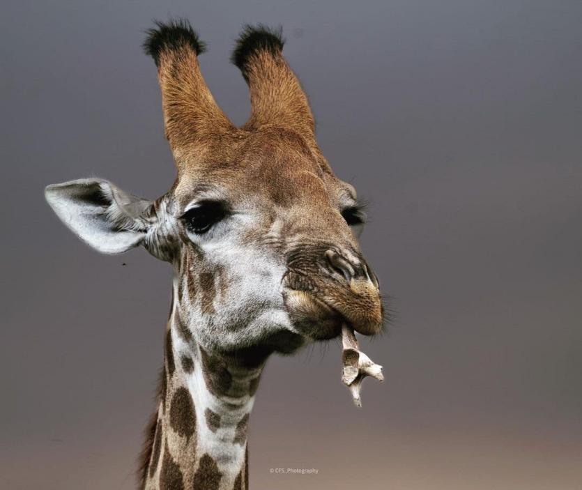 還有這張拍攝于2018年,地點(diǎn)不詳。這只長頸鹿叼著一個羚羊頭骨。