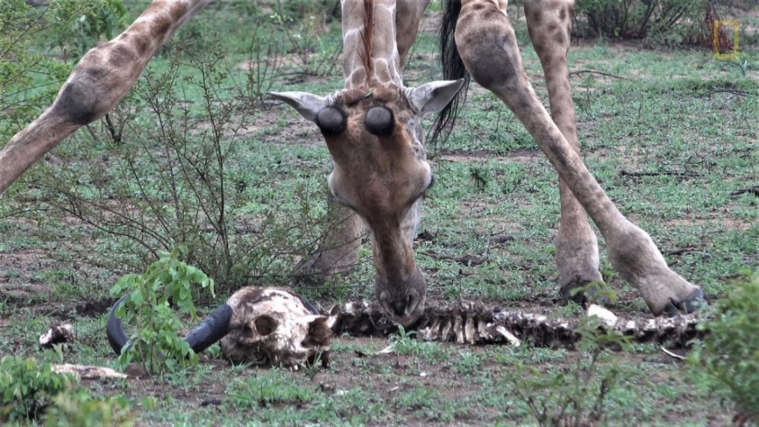 下面這張照片拍攝于2017年,這只長頸鹿在啃食一個水牛的骨頭。