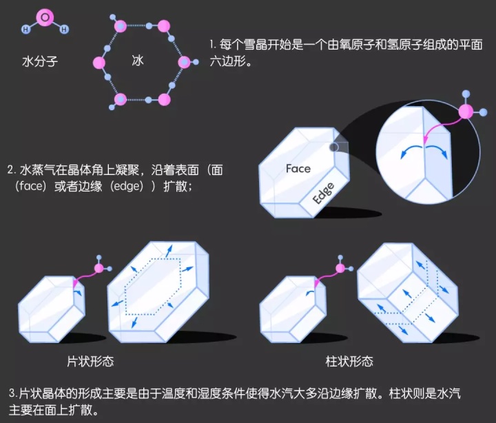 雪花的本質(zhì)是冰晶,冰晶是水汽在冰核上凝華增長(zhǎng)而形成的固態(tài)水合物,是雪花形成時(shí)的必要介質(zhì),可以看作是幼年期的雪花。隨著冰晶的長(zhǎng)大,多姿多樣的雪花也就形成了。