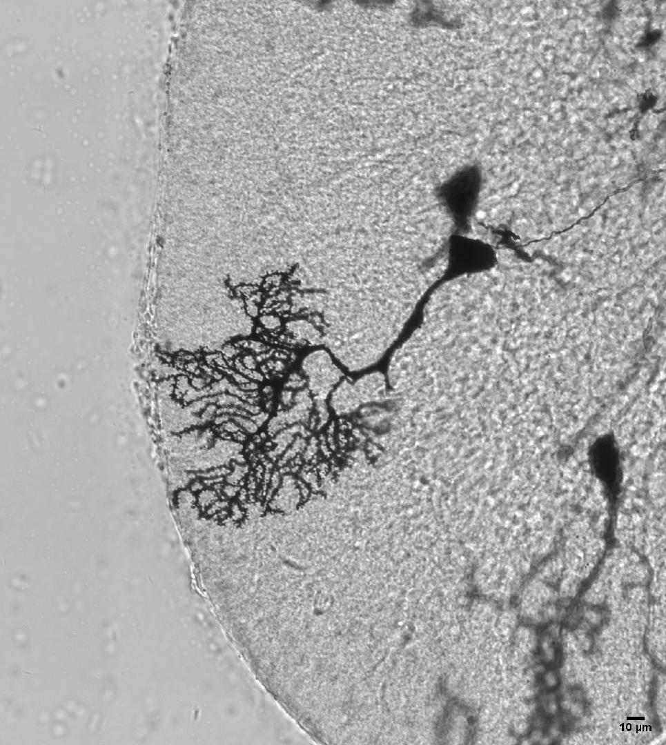 小腦浦肯野細胞是小腦中最大的神經(jīng)元,在特殊染色下,這些細胞像一顆巨大的樹,小腦中有無數(shù)顆這種“樹”。1873年,意大利神經(jīng)解剖學家卡米洛·高爾基(Camillo Golgi)發(fā)明了高爾基染色法,這種方法使得神經(jīng)細胞的結(jié)構(gòu)得以清晰地展示;與此同時,西班牙神經(jīng)學家,圣地亞哥·拉蒙·卡哈爾(Santiago Ramón y Cajal)利用高爾基染色法,提出了神經(jīng)元學說,開創(chuàng)了現(xiàn)代神經(jīng)科學。然而那個年代沒有照相機,對大腦中各類神經(jīng)元形態(tài)的記錄只有手繪稿。時間來到21世紀的今天,對大腦中神經(jīng)元形態(tài)的快速捕捉從未如此便利。我希望記錄下小腦中這一個個如此美麗的細胞,向兩位先驅(qū)致敬!